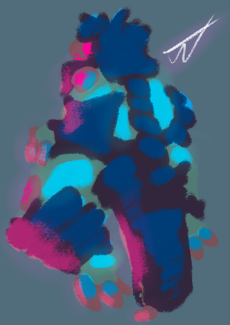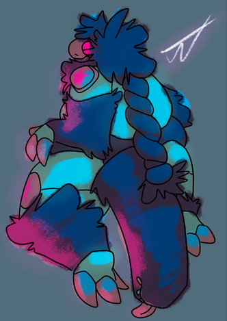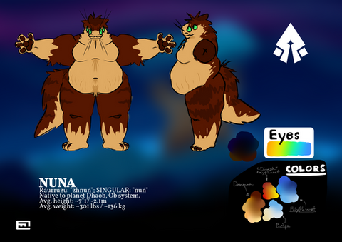 Part of a 3+ year old worldbuilding project, and having been through several changes, the Nuna are a species of space-faring creatures. They can vary in fur color from blue to brown-- *rarely, they have an orange tint. Likewise, the eyes can vary from orange and brown to yellow, with the *occasional green and teal. They have a long, wide tail, a set of moderate claws on each finger, and whiskers on the snout and head. Males have shorter whiskers than those of females.