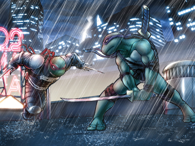 And I love how the neon sign off picture reflects off of Raph's armor. Very nice touch.