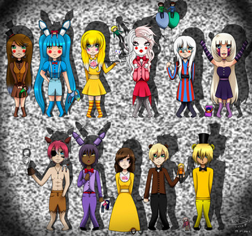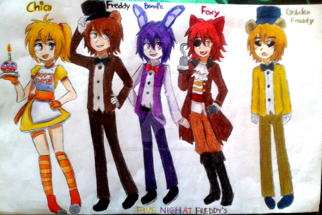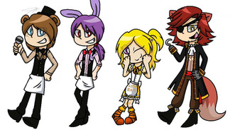 Well, we remember this picture I did for the Mini versions of the FNAF Animatronics/Androids (fav.me/dbpzezm ). Well, I stated that they had alternate costumes for when they were assigned to entertaining children (or at least, more conservative folk), so these are they.Fredi gets a much less skimpy version of her usual costume, Bonnie gets a "street dancer" style costume to get more hip with the kids. Chica gets a long, red gown to further showcase her status as the lead singer; and Foxy gets a less skimpy version of her costume, as well as blunt hook. Safety first!