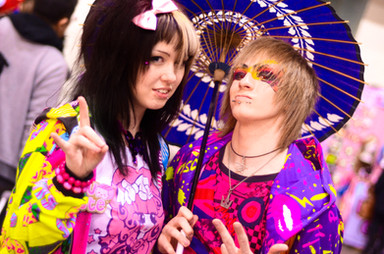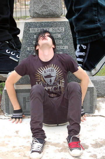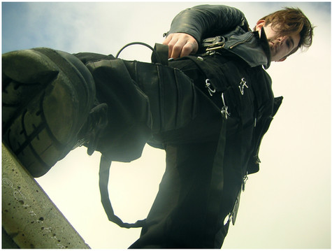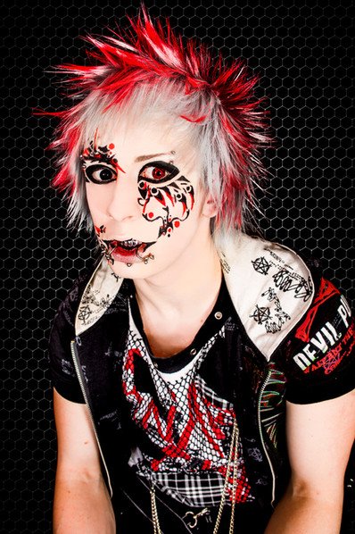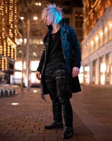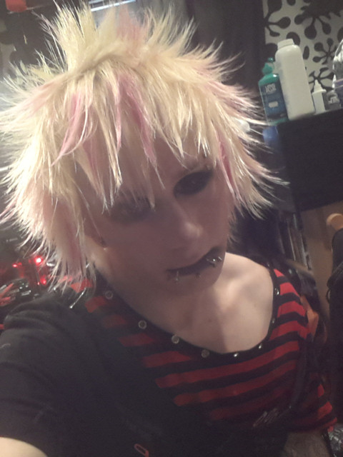 The photo is very well done and leaves an impression of "I don't care what you think as long as I can do what I want" at least that is what I interpreted from it. I like the hair color and piercings because it adds to the message, that I have interpreted from the photo. I like that the focus of the photo is set to see the determined look on your face and hand gestures. I think the background could have been experimented with more and maybe have done a test run of a flame background but I do like the black and how it helps focus on you more than anything else that could have distracted your audience. I also like that the clothes coordinate with the shoes and hair because it directs even more attention to your posture and stance taken within the picture. Overall the picture is very well done with zero blurriness where the main focal point is. The flow is very good also because it draws from your right foot up your leg to your pointing finger then to your face and down to the middle finger that you are holding up with your left hand.