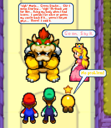 See? Sometimes, I can create some unique situations from inspiration. ^^ And no, Mario isn't evil. Him hurting Luigi in Power Tennis? Brotherly Jealousy. And he appreciates him in Dark Moon. Hurting Yoshi? Yoshi is loyal to Mario. He doesn't punch Yoshi, his arm could be distanced from his head. And the ol' sacrifice? Yoshi can teleport by changing to egg and teleport to the nest as seen in SMG2. Cheating on Princesses? Pauline is in the past as I just explained, and Daisy? The Rosalina's reborn galaxy theory explained in SMG. I still ship Mareach. And I respect Maraisy. ^^