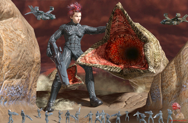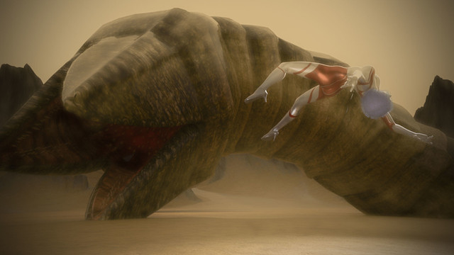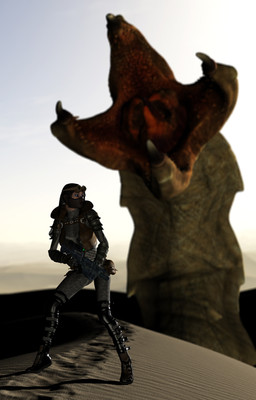 Hahahaha. The worst thing is, the worms are really far behind her. I had her standing next to the one in the foreground and she didn't even reach the tip of he mouth on the right of the image, she looked tiny! If still never really found a very eefective way of keeping their scale looking massive when characters are bough into the foreground with them behind. Then when I put a character next to them, it throws the shot of balance wise. One day I'll get it!