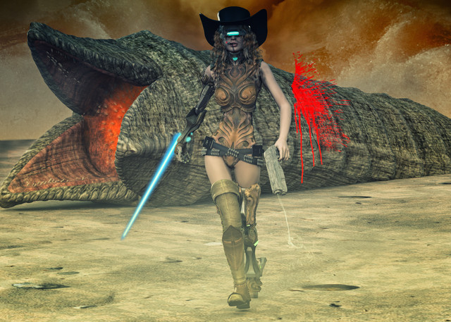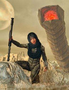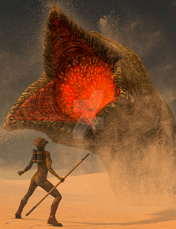 I guess that's the problem with giant sand worms, you put your thumper down to call one, wait around with your maker hooks and riding gear for 20 mins and then three turn up all at once! Typical! *rolls eyes*I am kind of semi happy and un-happy with this one. I tried 4 different attempts at getting the sand right on the worms and this was the best of the bunch (and was the second attempt) but it still dosen't feel quite right. Maybe if I had a little more experience in digital painting I could have pulled it off a little better, but none the less this is the best I could do.