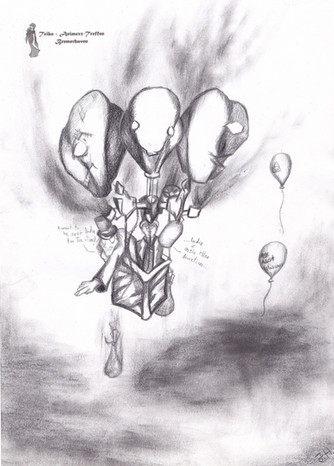 first part drawn (snippy and captain) in january, during a long waiting time at my postgraduate training course, without reference.second part (red balloons)drawn at the end of february at home. reference for mr. kittyhawk and drone used.