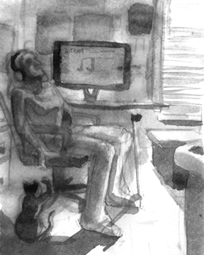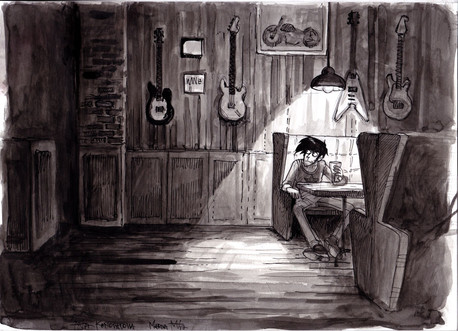Your method of communicating that sound is quite effective. I love your style. What you did here almost looks like charcoal. I also wanted to comment on the composition, which is a bit heavy in the right side, but works thanks to the figures in the background creating some good lines.