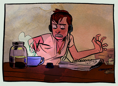 Final solution for Fred Lynch's "The Sound and the Fury." The assignment was to make an illustration about a sound you hate, black and white, fixed size.I was so excited to get this assignment. Years and years ago when I was just getting the idea of going to art school, I toured at the Montserrat College of Art (a very good school), and I was part of a tour that stopped by Fred Lynch's upperclass advanced illustration class, which was critiquing their versions of this very assignment. My mom and I sat down to listen and didn't get up for the rest of the extensive critique. I was enthralled. That critique, and Fred's teaching style, was one of the biggest reasons I decided to go to art school. So anyway I was pumped to try my hand at this.