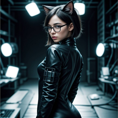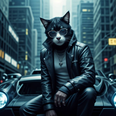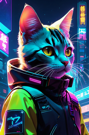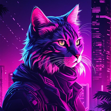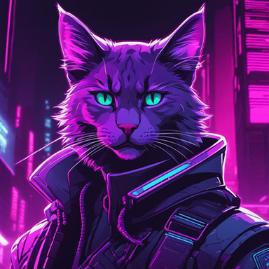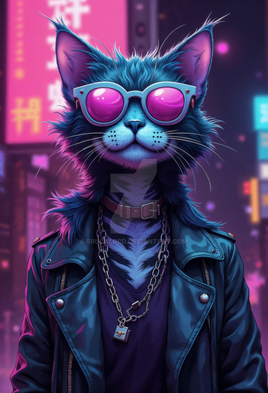 #digitalart #cat #cyberpunk #feline #neon #furrymale #kitty #characterdesign #scifi #fanart #digitalpainting #ai #animal #cartoon #face #furryart #glasses #leather #portrait #purple #generated_by_ai