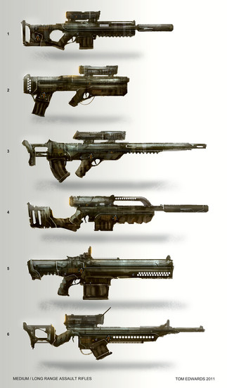 number 1 and six. the others either look uncomfortable to use or are to blocky to look like a proper gun. the last one is more like a assualt rifle type. but both of them are very well designed. could most certainly see them in a film or game as final pieces of work to be modelled.