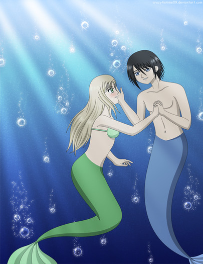 in the not so far kingdom, a person heard a scream for help, not thinking much, he swam out of his kingdom, to hear where was that shout coming from and rushed over there like a bullet. He got there really fast and saw a mergirl swimming for her life and a shark just behind her. He could say what the outcome would be, if he just stand there. So he fired towards the shark, knocking him out with his white fin. He then looked back at the mergirl, he never saw something like that before, SHE HAD NO ARMS! He swam closer to her s l o w l y to make sure she won't freak out.