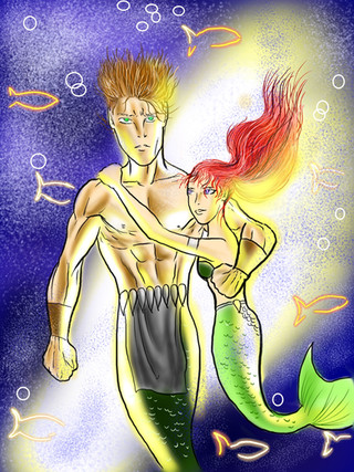 Still horrified even after the merman knocked out that shark, the pale blonde haired, light rose tailed, armless mergirl backed up from the merman that saved her because no one had ever helped her before in her young life