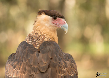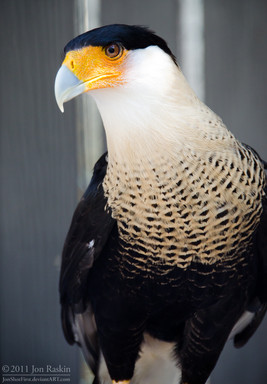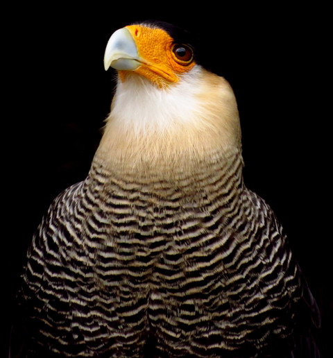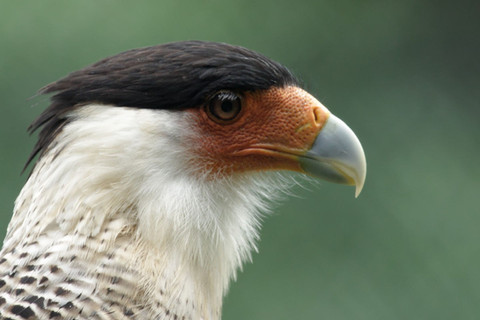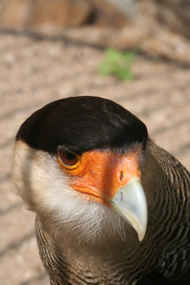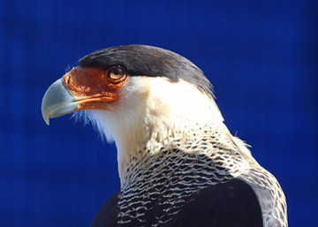A Crested Caracara in a wildlife rehabilitation center awaits healing and release. The image shows the head and upper torso of this colorful raptorFileName: BuschWSCaracara 00002