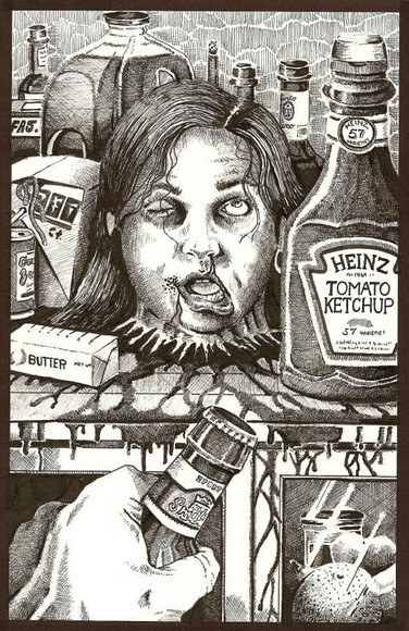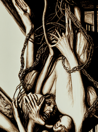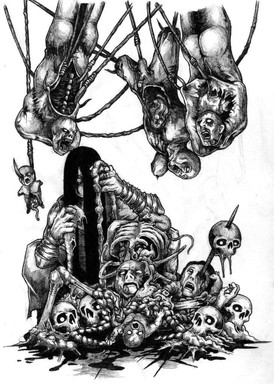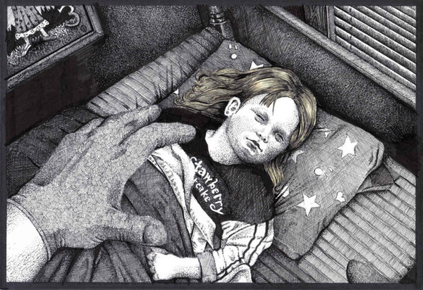 An illustration for the upcoming BLACK INK HORROR #1. This one is for the story "Alison's Garden" which, although quite nasty and graphic, was strangely sad and poignant. Although there were many scenes in it that I could have exploited visually, I went for something a little more subtle (yes, believe it or not, this could have been much worse). I've been working really hard on making the compositions more interesting, hence the use of the hand in the extreme foreground and the positioning of poor Alison in the background. I hope it worked.Pen and ink--about 20 hours.