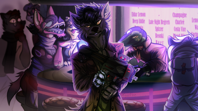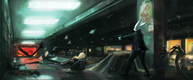 #artwork #bar #bunny #club #drink #glass #gun #illustration #landscape #neon #nightclub #painting #rabbit #scene #scenery #suits #art #tomtc #alcohol #digitalpainting #storytelling