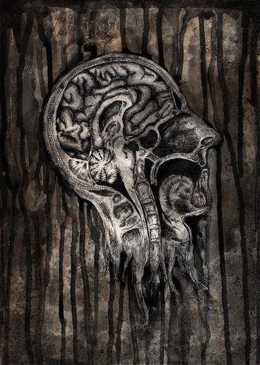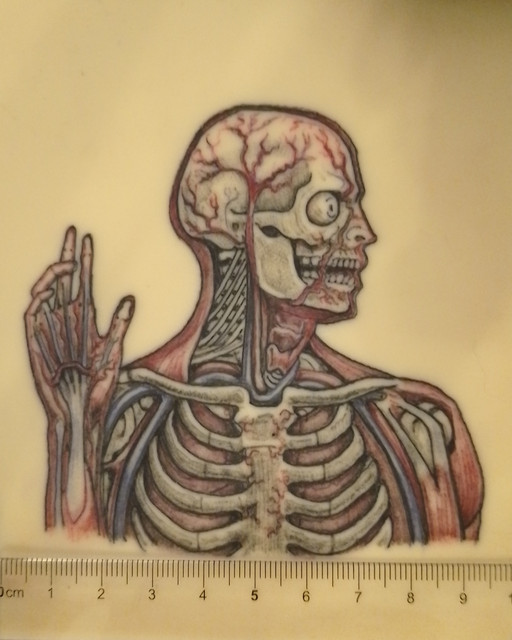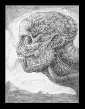 Mutta nämä on vain vertailuja ink10:een. Tässä on paljon muita ansioita. Pilkottava selkäranka on vangitseva ja sitä suojaavassa "kilvessä" on kaunis osterimainen muoto. Tai jos seuraa sitä vielä pidemmälle, niin siitä paljastuu kalmari. Siihen kaveriksi taas valkoinen silmäaukko, niin ne muodostaa kolmistaan joko jonkin eläimen pääkallon tai facehuggerin tyyppisen olion. Toisin sanoen paljon tätä dali/eschermäistä tulkinnanvaraa, että voi nähdä yhden asian useampana, ja kaikki on melkeinpä yhtä valideja tulkintoja.