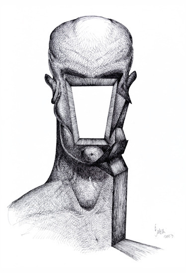 Selvä veriveli tussi10:lle, mutta muutamassa oleellisessa kohdassa jää alivoimaiseksi. Muoto on pökälemäisempi, kun kontrastit on pienemmät, eli vähän tasapaksumpi. Ja jos siirretään tarkastelu muodoista esittävyyden aspekteihin, niin silmä varastaa aika roimasti huomiota. Siinä on levottomuus, mitä elämässään luovuttaneella ink10:llä ei oo silmissä. Iiris on hyvin kirjaimellinen huomion keskipiste.
