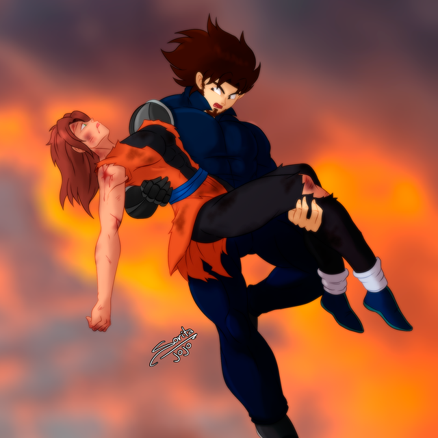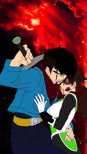 Finally done with his sick and twisted torturing, Deema grew bored and was about to dispose of the pathetic weaklings and their sad excuse of a planet when he felt an almighty force hit him across the face and send him flying. When he regained his senses and fully realised what had happened, he turned to see his long-time enemy floating in mid-air with the 'bitch-saiyan' cradled in his arms.