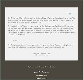 A quick-handy guide to the HTML involved with making a journal skin. This is just a(-n incomplete) skeleton of what the journal looks like.Written in Notepad++ and made presentable via Photoshop.