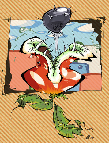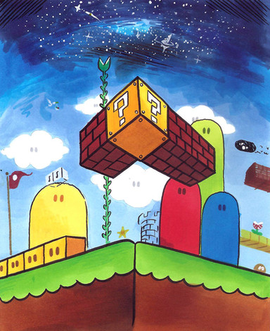 I always thought the NES Super Mario Bros. had some seriously awesome style goin on. Maybe it's just a nostalgia thing now, but nevertheless, I still think it's got some great aesthetics.I did a rough sketch of this a while back, with the idea that I would redo it with vectors later, and add the aging effects and etc. I never got around to it until now. I must say, I'm very happy with the result, which is unusual for me. I do think that the fraying could be improved, and the very bottom is somewhat plain, but overall, I'm happy with it.