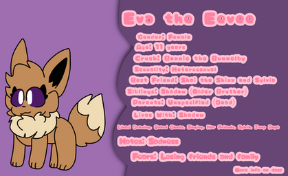 Eva is not actually related to her current family (Colton and Gladys). She was found in the woods by Colton one day, with no sign of her parents. She was saved by him from almost being attacked by a wild Pokémon. Colton had a strong feeling that he should take care of her until he found her parents… and they never did find them…