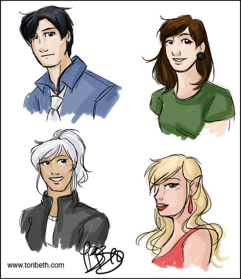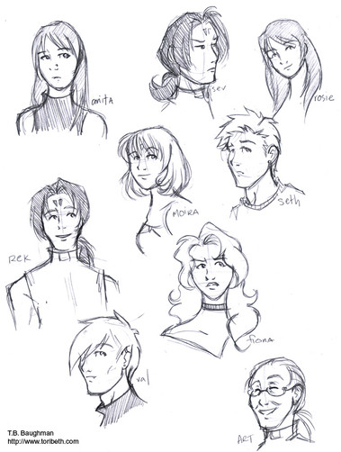 Three ACEO/ATCs, put together to form a scene with four of SEKRIT PROJEKT's main characters: Anita, Sev, Moira and Rek.Colored pencil and ink on three pieces of 2.5x3.5" bristol board.