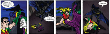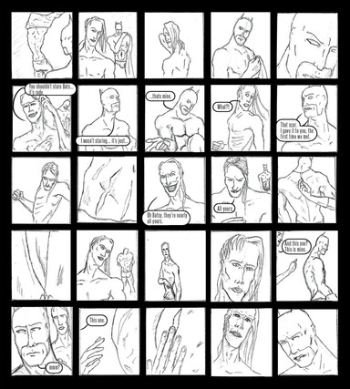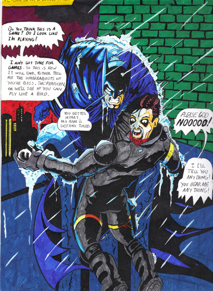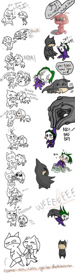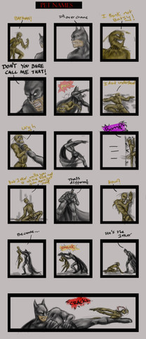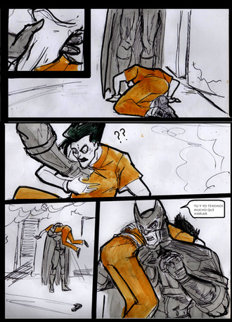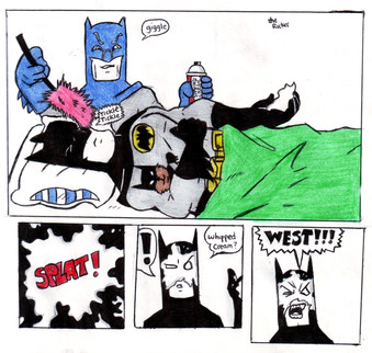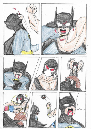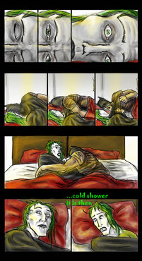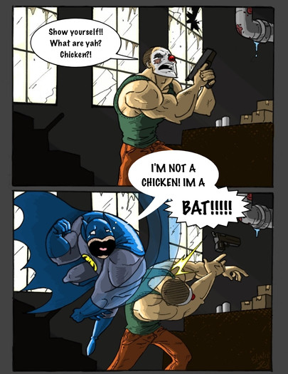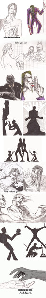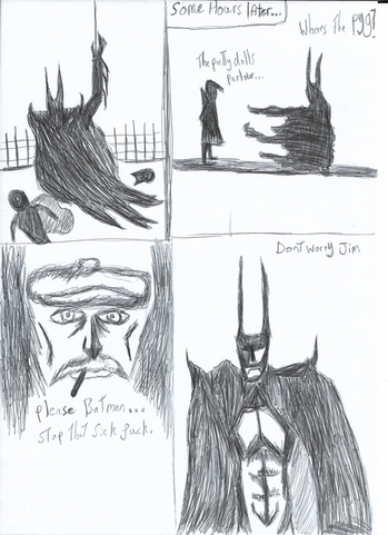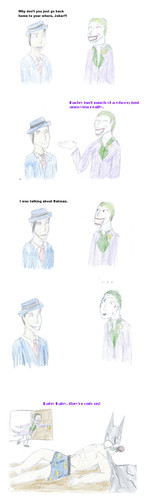 Yeah bitches! Thats right I got rid of my art block now suck on my metaphorical di- *cough* ...sorry. I'm just a little excited, it's been a while....and all. The style has turned back to a slightly more simalar one, not to mention easier to do. The other one produced clean lines and made it more stylised but I kinda prefer the rough and ready aproach. What do you's think? I still hate backgrounds.Silly Batman and his wound up mind tank. It's not like he's taking this too far at all *cough*. Anyway yeah after that whole argument Batsy stormed off to the gym to do his morning routine and blow off some steam, but as you can see it doesn't really help. And look! Two people who arn't B&J, yeah I started off telling you's that this place was full of people but other than the big guys you havn't seen a soul.... and I'm going to keep it that way except for special occassions or were its needed for plot. We both know that Batman and Joker arn't very sociable creatures so just think of it as them avoiding everyone and it'll be sweet.