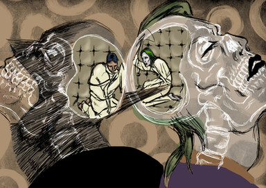 pressing heads together,
