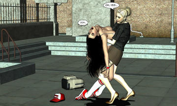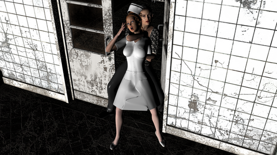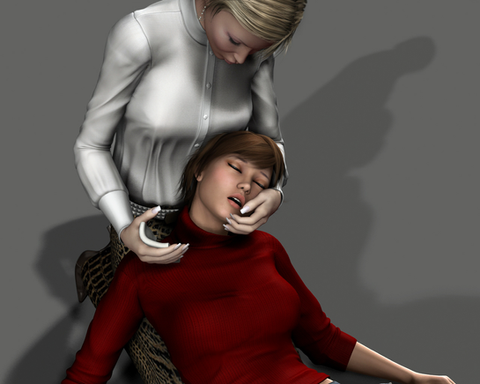 Every pose looks natural. Every countenance is unassumingly expressive. The breasts of both subjects are large, but realistically shaped and not particularly exaggerated. The exposed cleavage of Rachel Fox (the blond) is surprisingly and wonderfully unobtrusive! The shifting weight of a limp human form is conveyed perfectly, even though neither subject is currently moving. The FEEL of this picture is the best part of it: Amanda's unconsciousness looks restless, because it is not sleep. Rachel looks tired, even if only in anticipation of the burden she is bound to bear. Amanda's fingers are curled, as if her hand is that of a corpse, reminding us that she is in danger. IN SUMMARY: This is a believable scene rendered entirely realistically.