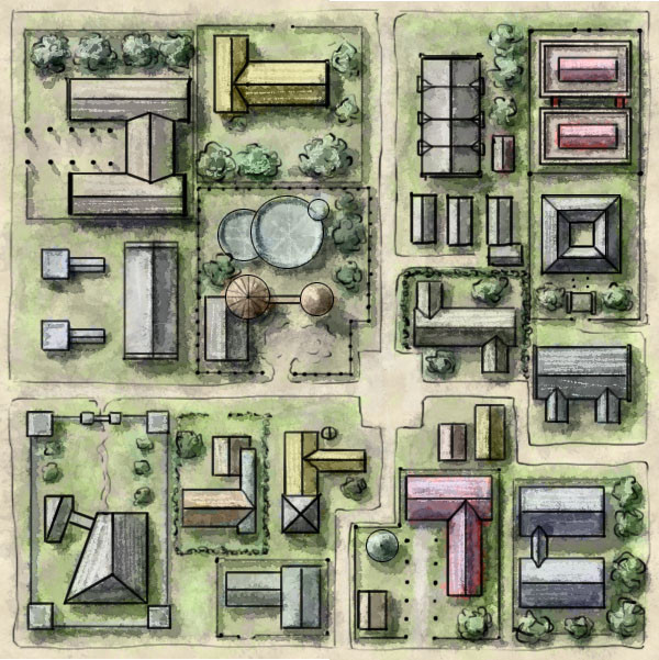 This is a city map tile depicting a university district. It's designed to go along with three other tiles to help build up a modular city. You can find the others on my blog here: [link] as well as a link to the Wayfinder free fanzine that these were created for.This is Creative Commons CC-BY-NC-SA licensed. Enjoy!