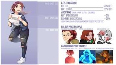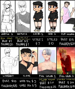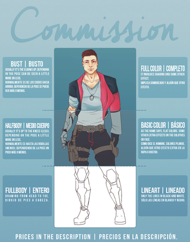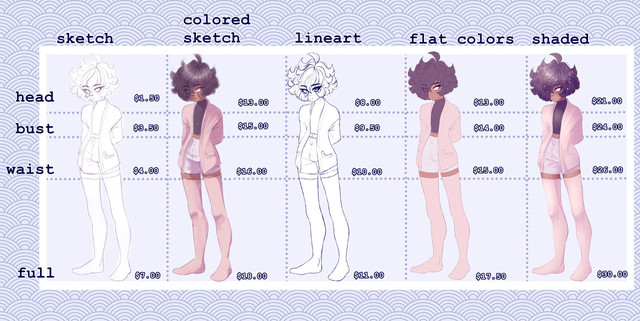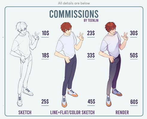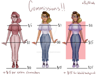 - the type of commission you want (full color bust, sketch half body, etc.)
