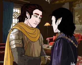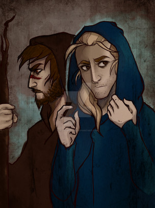This is another one of my more recent works, I'm not terribly fond of it, something about it bothers me. The two characters are from an RP I'm in, the closest one, in blue and grey is my character, he's a clumsy necromancer with a knack for tripping on his coattails, lol. The one behind him is a spy. These two hit it off a bit more than anyone expected in the RP.This picture took a bit of time, I got lazy towards the coloring process. I really need a new art program. CorelDraw 4 is terrible lol.