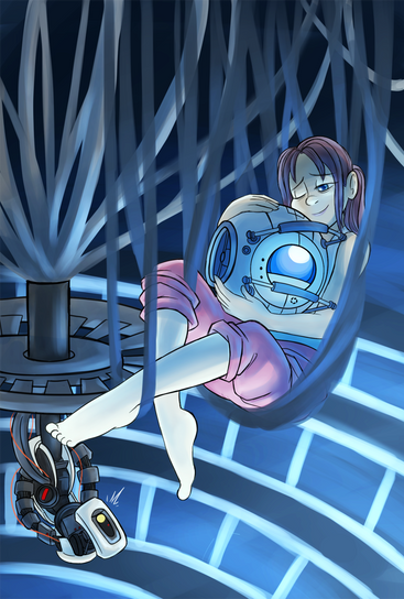 GlaDOS being grumpy and cranky again, Rat Man (not pictured) scribbling away about the Mantis Men and something about a bunch of color-coded mercenaries fighting in an abandoned lab called Turbine or whatever, Chell listening to Wheatley rambling about classic works of Literature, and the Companion Cube dreaming about showers.