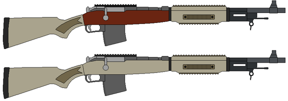 The m/1 Rifle is the earliest Republic military long arm. Chambered in the venerable 7.62x51mmNATO rifle cartridge, with a magazine capacity of 20. After the Liberation and the earliest wars, this sturdy weapon was relegated to a ceremonial role. The weapon is used by guards in many places, including the Senate, military memorials and graveyards, important monuments, offices of statesmen, etc. etc. The weapon, when made from modern materials and with modern ammunition, can easily rival many more modern weapon designs. This rifle is the last purely mechanical weapon left in the Republic arsenal: all components are made from metal or wood, no electrical addons can be mounted without their own power sources, and aiming is completely manual. This is also one of the few weapons that have been designed to mount a bayonet.The weapon is strictly semi-automatic, but a fast enough shooter can reach a momentary 200rpm.