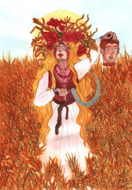 #cythe #demeter #drawing #goddess #gold #greek #harvest #illustration #ink #mythology #red #roman #sicle #watercolor #wheat