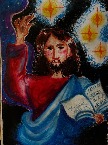 Woah, I love the pastellike feeling of your background! And of course, his face is very expressive and so very gentle! I also like the triangle composition, especially with the angels basically being reverse triangleshaped to pop out, great work!