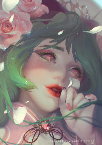 Beautiful! I adore her green hair/ eyes & lovely tan flowers.