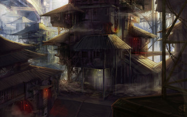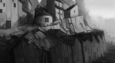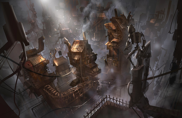 Nice detailing! I'm somehow very curious about that daunting silhouette in the background. Makes me think of the tower in Professor Layton and the Curious Village somehow. I guess that's because everything in that game is steampunk'd...