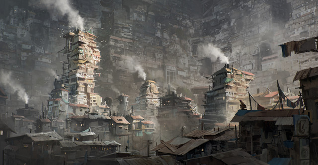 It a shot of , or at least a small part of, the city state of New Crobuzon from the book "Perdido Street Station". The shadow in the background is the namesake of the book. It's supposed to loom in the background, massive and daunting as a symbol of political power.