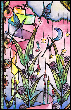 Done with Prisma color premier markers, Glaze Sakura gel pens, gelly roll Stardust Sakura gel pens, Deco color paint pens, Zig writter pen, and Sakura Identi-pen, on smooth Bristol board.