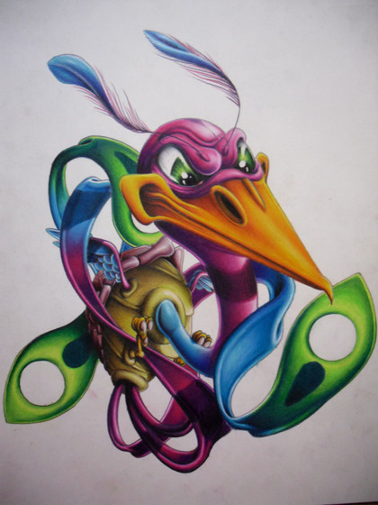 Not pleased with the way this scanned. I'm pissed off at my computer so I didn't fix any of the rough patches yet; I don't have the patience to mess with it right now.Prismacolor markers, a red paint pen, gold paint pens, and a micro sharpie on bristol board. Looks so much better in person, as usual. Theres a Chemical brothers song called star guitar that sort of played a part in the creation of this.
