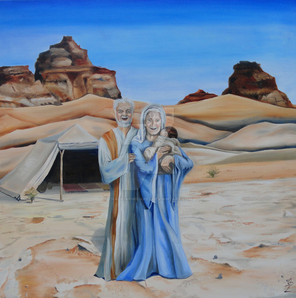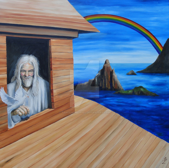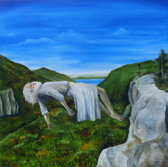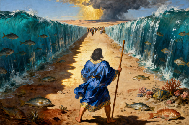 Some of the anatomy and perspective, such as the seafloor and Moses's left hand, hasn't been fully developed before it was painted; it's off. The colors are sort of dull, so it doesn't capture the eye in a way that it could have. It seems as though you were attempting to give a sort of sad feel to this piece, but I'm not sure how that would make sense. The way I understand it, this should give a feeling of hope or awe. Moses uses his god given powers to part an entire sea so he can lead his people to freedom. This should call for a bright sky, or something similar. Also, he hills ahead of the split sea look foreboding. I suppose it's scary to leave the only life you've ever known behind and enter the unknown, but I'm not sure that's the best message to give on this story.
