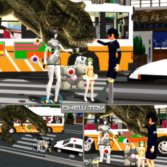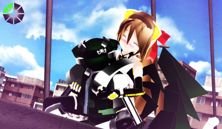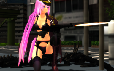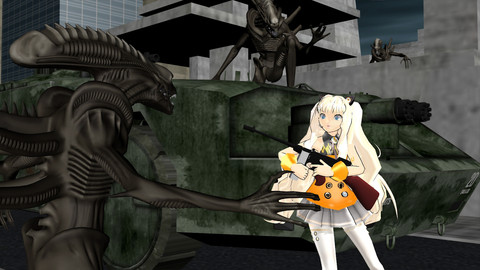As Chibi IA reported here [link] , the older members of the "gang" came down to Azure Town to do battle with the evil aliens. The ATI (Azure Town Invasion) images are a series of vignettes showing these girls in combat. Really an excuse for me to do something different with them for a change. The compostions and effects borrow heavily from comic book and fantasy poster styles. All images were rendered in MMD and reworked in Photoshop.