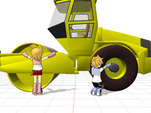Someone wanted to see more of Rin's Roller, especially seeing it being operated so here it is. Note that Rin's Roller is based on a real world prototype, but has been 'customized'.The images shows Rin operating the roller and Len inspecting the roller wheels to make sure that they're debris free before allowing the roller to roll on the newly poured road section up ahead. Ranka at the back is redirecting traffic. Should have added traffic cones, but I was too lazy to make/find any.