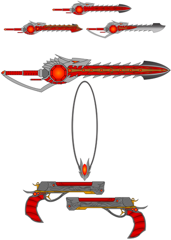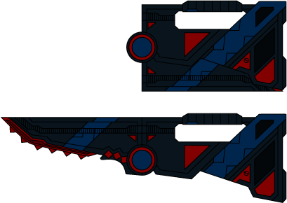 The Attache Shears are the personal weapons of Kamen Rider Zwei. Sliding the panel to reveal the second grip allows Zwei to separate the case, and the blades extend with a flick if the wrist. Zwei uses these twin blades expertly, and can close one blade to dock the halves if he needs one of his hands.Pulling the trigger initiates the Kaban Cross finisher, a pair of sequenced slashes in an X-shape. Charging the weapon in Attache Mode and reopening it will initiate the Kaban Cleaver finisher, wielding both blades together for a single massive slash. Inserting a closed Progrise Key will charge both weapons with the Key's Ability for a special attack.