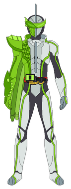 Shielding Turtle is Flash's primary form, using the power of the turtle. Hisashi transforms with the ShotRiser in Gun Mode, pointing the weapon straight up and punching the bullet as it descends. This form is sturdy and strong, acting in support of his allies and keeping civilians clear. Flash uses sudden, simple movements to fight, and is able to project force fields that resemble turtle shells from his armor.