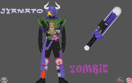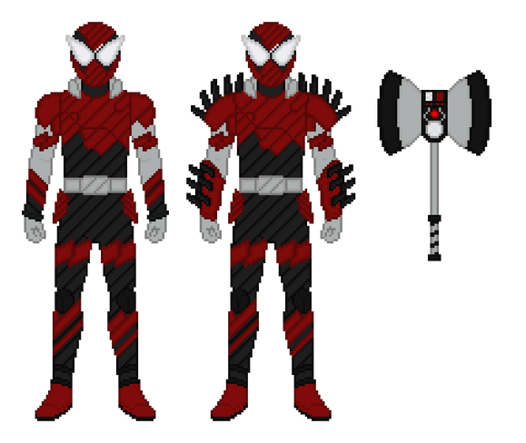 Naxa trades Buckles with Rabid early on in the fourth round of the DGP to get an edge on Swerve. She places this Buckle in the Desire Driver and lowers the guillotine blade to access this black and crimson upper form. Naxa is able to hide within shadows in this form, adding the element of surprise to her attacks. The buckler on her left arm has a secret blade hidden within it. She is also armed with the Slasher JigSaber, a handheld saw weapon. Squeezing the trigger on the weapon causes the blade to spin and scatter blood red energy droplets.