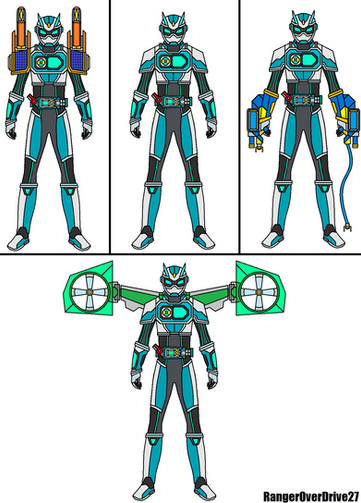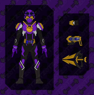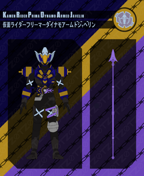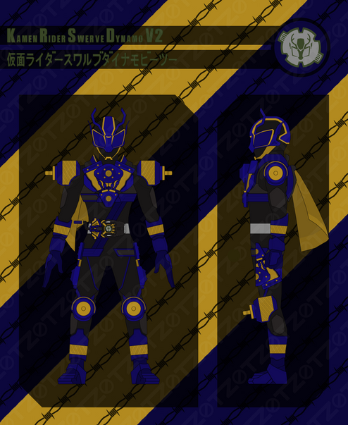Rabid borrows the Dynamo V2 Buckle from Swerve during the Jyamato Grand Prix, and inserts it into the Desire Driver to access this navy and gold powerup form. His speed and ability to generate electricity are greatly increased, and by using the Revolve On function, Rabid can transfer that electricity to another Rider, giving them a brief burst of speed and vitality. Despite its ability to generate energy, it takes a lot out of a person to use this Buckle, and they'll feel it as soon as they exit transformation.