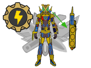This form allows him access to the Dynamic Module Hatchet Dynamo. This powerful battle axe crackles with energy the more it is swung around, letting Fourze wind up for powerful blows. By inserting the Dynamic Switch into the socket on the handle, Fourze can execute one of two Limit Breaks. The first is the Dynamic Chop, where Cosmic Energy is channeled into a melee attack with the axe. The second is the Dynamic Boomerang, where energy blades can be fired from the swinging weapon.