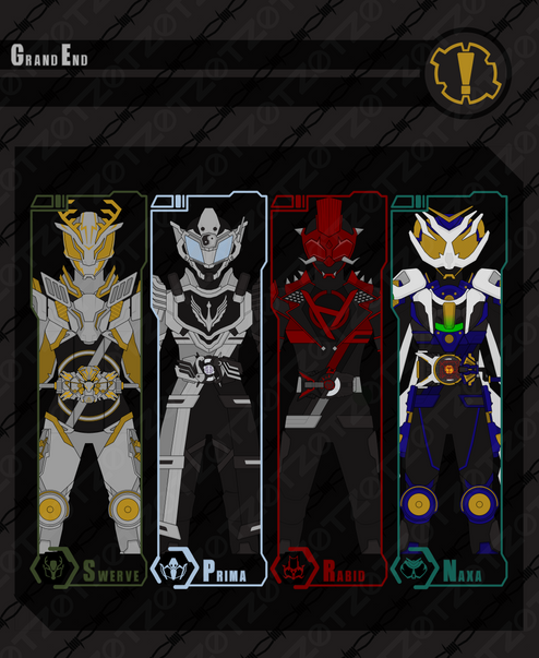Eight Riders make it through the treasure hunt, having collected a Raise Buckle while avoiding the Jyamato. Shortly after the game is completed, they are called back to the field to face another threat: The Jyamato are closing in on a highly populated area, and the Riders have been tasked with fending the monsters off. The Riders activate their new items, giving them more power to fight.Camus, however, still believes they are merely playing a harmless game, and de-transforms to reassure some civilians that they are safe, when he is fatally wounded by a foot soldier. Naxa, seeing her fathers face, tosses aside her Buckle and runs to him, sharing a final word of regret before he dissolves into static. Swerve was nearby, but didn't intervene because he didn't understand the stakes either, and picks up the discarded Armed Blades Buckle to double up his powers and win the round.