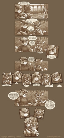 This process has gotten vastly more complicated since I started working on Lackadaisy. Pages used to be almost 100% pencil with just a little sepia tone added digitally. Now, after penciling, a panel often requires hours of additional work. (Put 12 or 15 panels together per page, and it adds up to at least part of the reason I fail so hard at regular updates.)
