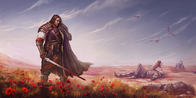 It's amazing. I love the colours and the whole dark feel to it. The battlefieldas the background is a powerful image, and I think you managed to draw in the death and pain that occurs during wars.